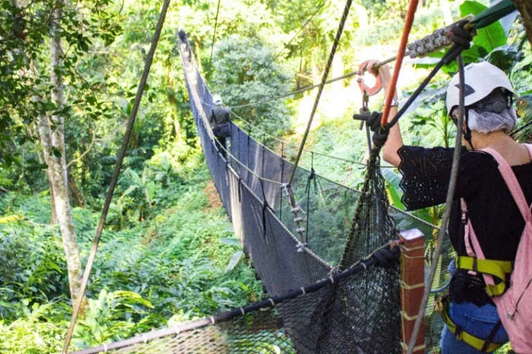 The suspension bridge is around 300 metres long and the walk is around 15 to 30 minutes depending on your group size. However, if you’ve a fear of height, think twice. You’d be stepping on a wobbly and narrow suspension rope bridge. You’ve to also attend a briefing and put on a harness, helmet and other safety gears before embarking on the walk. Sounds treacherous?