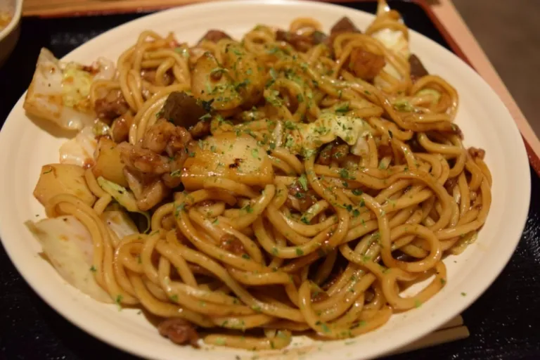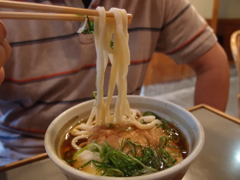 Another local favourite is the kitsune udon. Udon is made of wheat flour but unlike ramen, it is much thicker and offers a firmer bite. Kitsune Udon is a simple dish by comparison to others on this list and is generally made up of three components: udon, deep fried tofu, and green onions. The broth is light but tasty and the udon springy and filling. Perfect for the palette.
