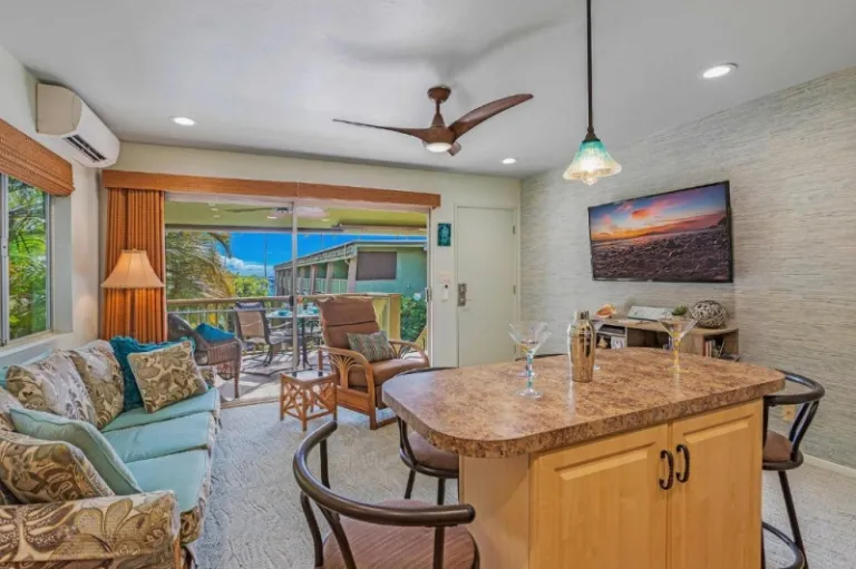 From this island-themed condominium rental in Kihei overlooking the sea, you can spot humpback whales from the roof deck. Other stand-out features include the king-sized bed, the bar counter, the air-conditioning, and the thoughtfulness of your host Gammy, who likes to provide guests with homemade banana bread. Right across the street of this condo, you can arrive at the crystal-clear waters and sea turtles of the Kamaole Beach Parks in South Maui. Now, isn’t that a steal?