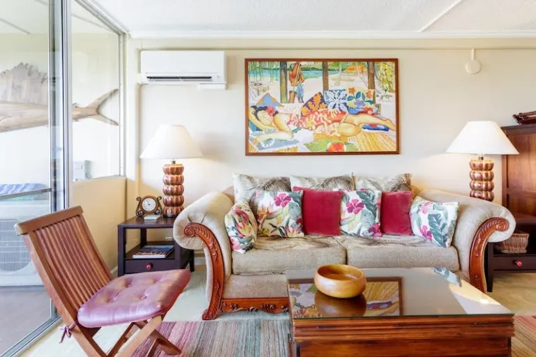 Maybe it’s the white-washed facade or the blue walls, but this pristine apartment in Kihei reminds us of the cliffside houses in Santorini. More than its striking design though, this Airbnb in Maui deserves a spot on our list because of its clean interiors and swoon-worthy views of the ocean. You can also find plenty of beach equipment for guests to use: towels, boogie boards, coolers, and umbrellas. Fire up the barbecue grill for dinner, or go scuba diving in Ulua Beach, Makena Beach, and Keawakapu Beach in your free time.