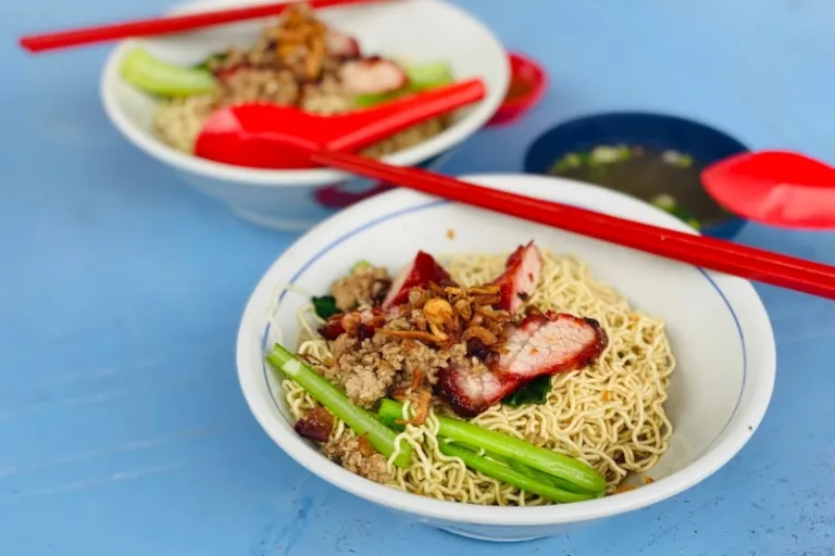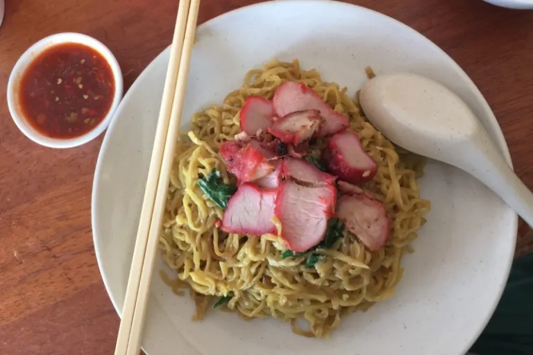 Kolo Mee is a Sarawak-style noodle dish served with dry egg noodles, fried shallots and onions, minced meat, and spring onions. Usually, it comes with sliced char siu (Chinese-style barbecue pork), a small number of vegetables, and a small bowl of soup. Unlike other Malaysian Chinese dry noodle dishes that are usually darker due to the use of dark soy sauce, Kolo Mee is usually served in a fragrant, transparent sauce or red sauce.