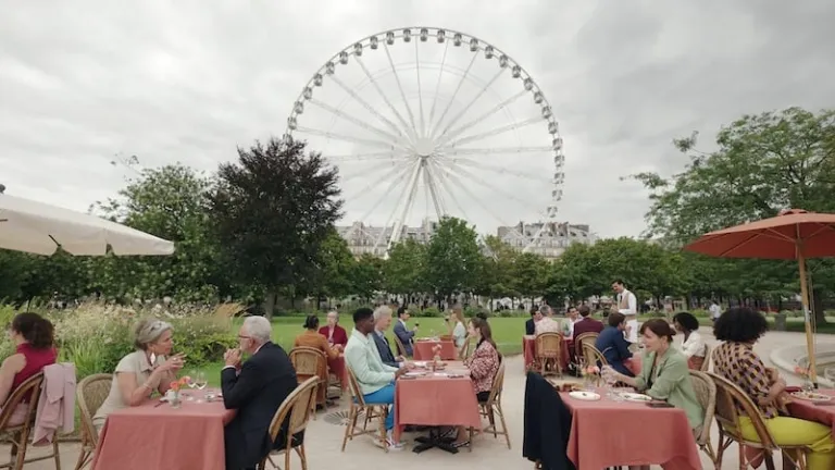 In the fourth episode, we see Emily having a leisurely al fresco lunch with Luc and Julien at the Tuileries Garden. She then admits that the unemployed life is not for her, and seeks their advice on how to get back to Sylvie’s good graces. As they sip on Kir royal, Luc points at the Roue de Paris, aka the city’s own emblematic Ferris wheel. He then offhandedly mentions it’s a go-to place for “doing the deed” — much to Emily’s shock.
