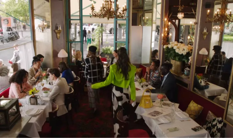 We first see an interior shot of the Eiffel Tower in the opening scene of Emily in Paris Season 3, specifically in Emily’s nightmare. In this dream, she is confronted by her bosses Sylvie and Madeline, both of whom she was secretly working for. This same scenario plays out IRL towards the end of the first episode.