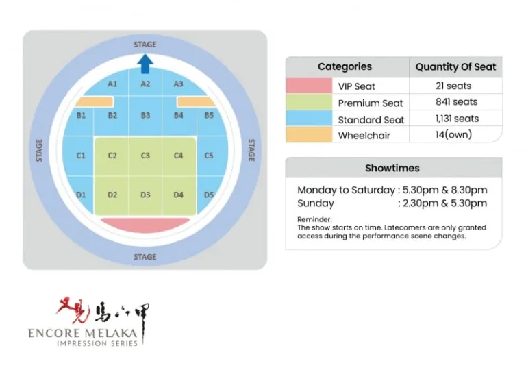 Naturally, ticket prices vary according to the seat category that you choose. There are also slight variations in terms of prices for tickets between peak tourist season and non-peak seasons. Regardless, expect to pay from RM128 (S$42 – Malaysian) and RM148 (S$49 – non-Malaysian) for a standard ticket. Concessional ticket prices are available for persons with disabilities (the venue is wheelchair friendly) too.