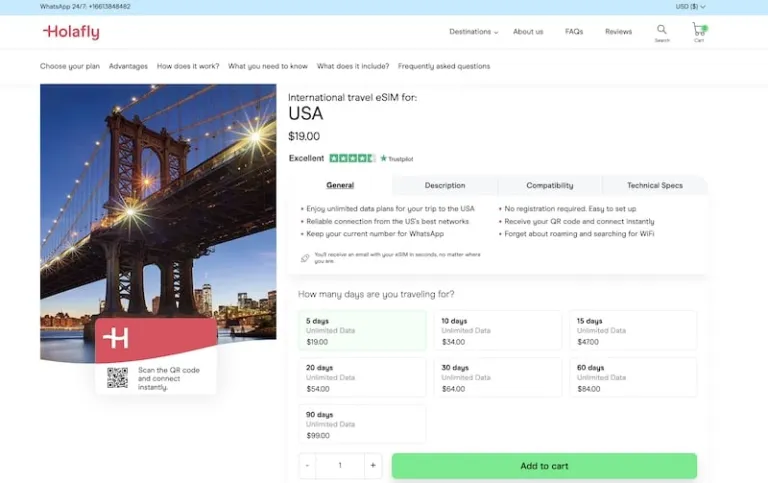 Holafly is a European company that offers prepaid eSIM for tourists around the world, including the United States. According to Trustpilot ratings, this company has an average rating of 4.6 out of 5, which makes it reliable for those who need to buy a data plan in the US. Next, we will tell you about its main advantages:
