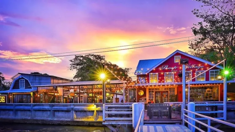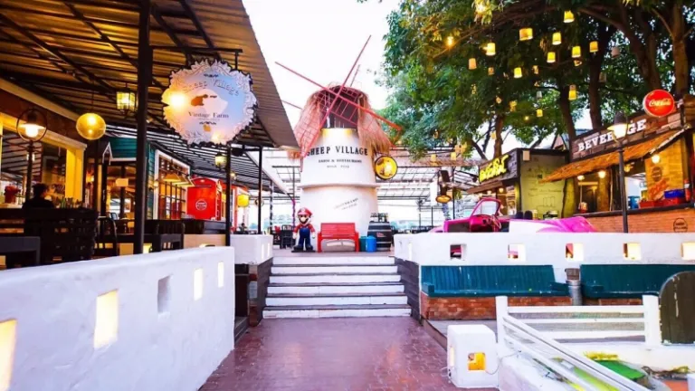 Sheep Village offers a European seaside village atmosphere with Dutch windmills, wooden barns, and a mini-farm featuring sheep and ducks. It’s an ideal spot for a relaxing meal with a view of the Chao Phraya River. Open daily from 2:00 PM.