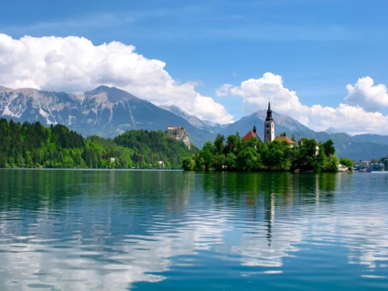 The emerald Lake Bled, with its waters surrounding the lovely island of Bled that sits in the middle of the lake.