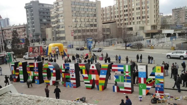 Bustling town of Pristina with high-rise buildings in the background.