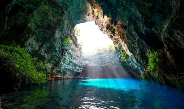 As the largest of the Greek Islands in the Ionian Sea, the magical island of Kefaloniá teems with pine forests, towering cliffs, olive trees, cobalt lakes, ancient castle ruins, and majestic caves. You can take a boat tour that will ferry you inside Melissani Lake, an underground lake with crystal-clear water that lets you see all the way to the bottom.