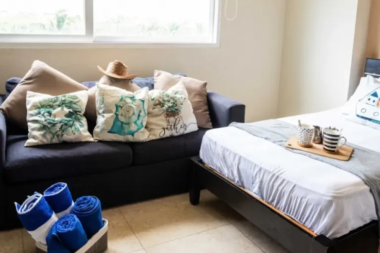 An elegant two-bedroom apartment with access to Oleo Cancun boutique hotel’s amenities. Choose between their all-inclusive system or cooking at home. Free access to the pool, jacuzzi, beach, gym, and tennis court. Fully equipped kitchen, high-speed WiFi, A/C, and washing machine included. A premium Airbnb in Cancun.