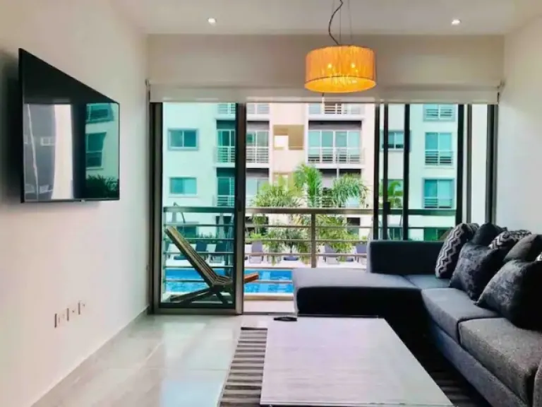 Relax with resort-like amenities like a shimmering pool, hot tub, and sun terrace. Stay active with a state-of-the-art fitness center. Inside, enjoy a fully equipped kitchen, spacious living area, and plush bedrooms for a restful night. This Airbnb in Cancun offers both luxury and comfort.