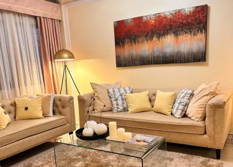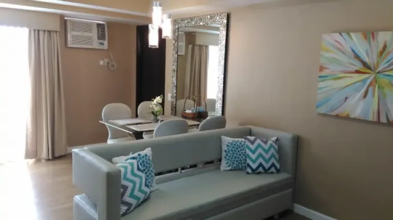 The living room is spacious and well-furnished, providing a great space for family bonding. The fully equipped kitchen allows you to prepare home-cooked meals. It has two swimming pools, including an infinity pool and a children’s pool, available for P150.00 per use. The property also features a children’s play area, a lush garden on the sixth floor, and a gym reserved for owners or long-term lessees.
