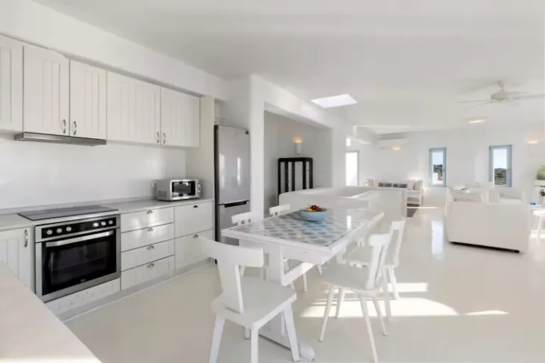 This is a stunning all-white interiors home that’s judiciously designed with perfect decor and furnishings. In fact, the whole space has a really great tranquil elements to it. Another major attraction is the location, as you’ll be right next to the Logaras Beach. Additionally, you’ll have facilities such as dedicated workspace and air-conditioning here.