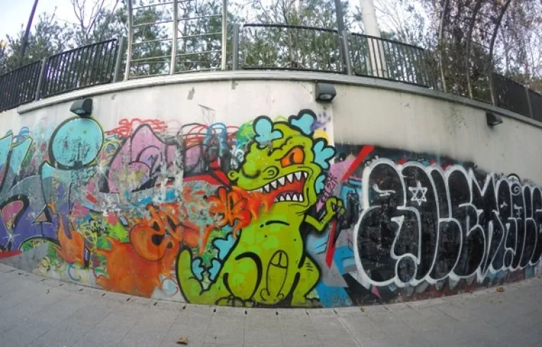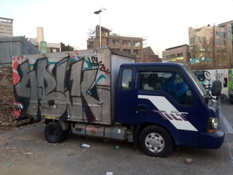 Even the vehicles parked in the area can’t escape the graff