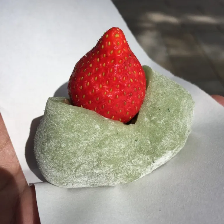 Matcha Sticky Rice Ball stuffed with red bean paste and topped with fresh Amao strawberries, uses the best strawberries in the country. I had this when I was in Nara. It can be found at the intersection going to Dondaimon Gate.