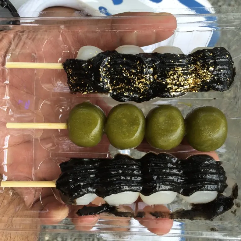 From top to bottom: Dango brushed with black sesame paste sprinkled with Gold dust, Green tea Matcha Dango and Dango brushed with black bean paste.