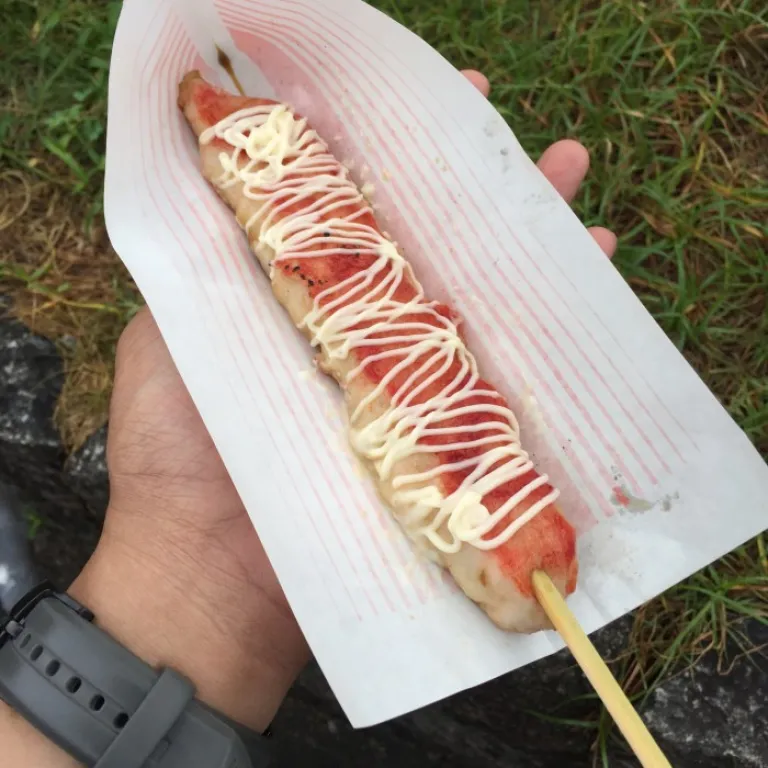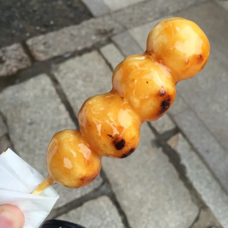 This is actually a sticky rice ball skewered on a stick. It may be grilled or just sold directly. It may also be brushed/coated with a flavoured paste or just plain. You can choose as there are few varieties of it. You can find this anywhere around Japan. Photos below are those dangos that I’ve eaten: