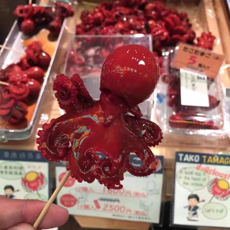 Too cute to eat. This is a known Japanese street food. These glazed baby octopuses have whole quail eggs stuffed in their heads. They are tender, delicious and inexpensive.