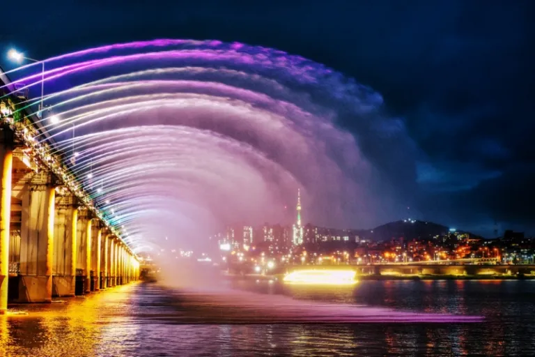 However, this attraction only truly lives up to its name at night. Be ready to marvel at an unforgettable show of lights, water, and music that make Banpo Bridge look like it’s bordered by a rainbow. The fountain operates every day from April to October, and springs to life about four to six times a day.