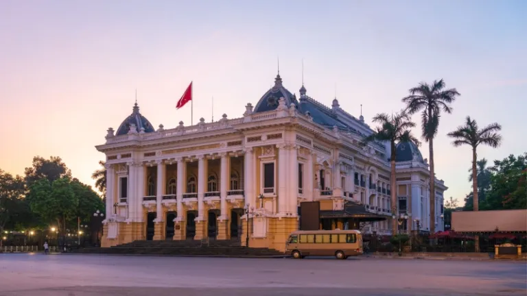 This beautiful yellow-hued Hanoi Opera House was built by the French in 1911 and modelled after the Palais Garnier, one of the traditional opera houses in Paris. It is one of the architectural landmarks of Hanoi and an example of classic European architecture: marble floors, copper chandeliers, and French murals on the ceiling.