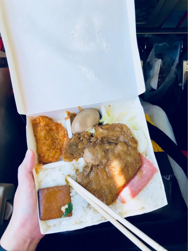 Triumphant and happy because we were reaching Hualien, with a lunch bento in hand