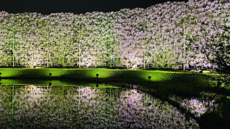 As evening descends, the park comes alive with illuminations, creating a unique yet truly magical atmosphere where the wisteria takes on a whole new life.