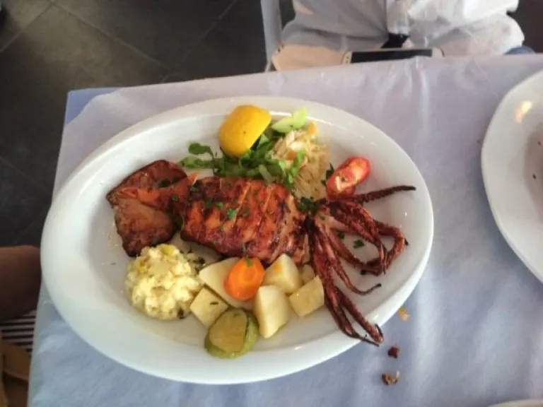 (Traditional Fave Beans, Fried Tomato Balls, Cheese Croquettes, Herbed Meatballs, Eggplant Salad-Tzatzikim Zuchinni Balls, Cheese pie, Fish Roe Salad) We decided to go for the platter so we could try everything!