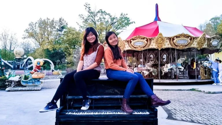 Indeed, never would I’ve thought of sitting on a piano top. All thanks to the park owner who provided us with a fresh approach to photographing with a piano! It’s tried and tested that the piano won’t break even with two people sitting on it. For a perfect duo shot, do try to mimic the actions of each other down to details like the angle you’re facing and the positions of your hands and legs.