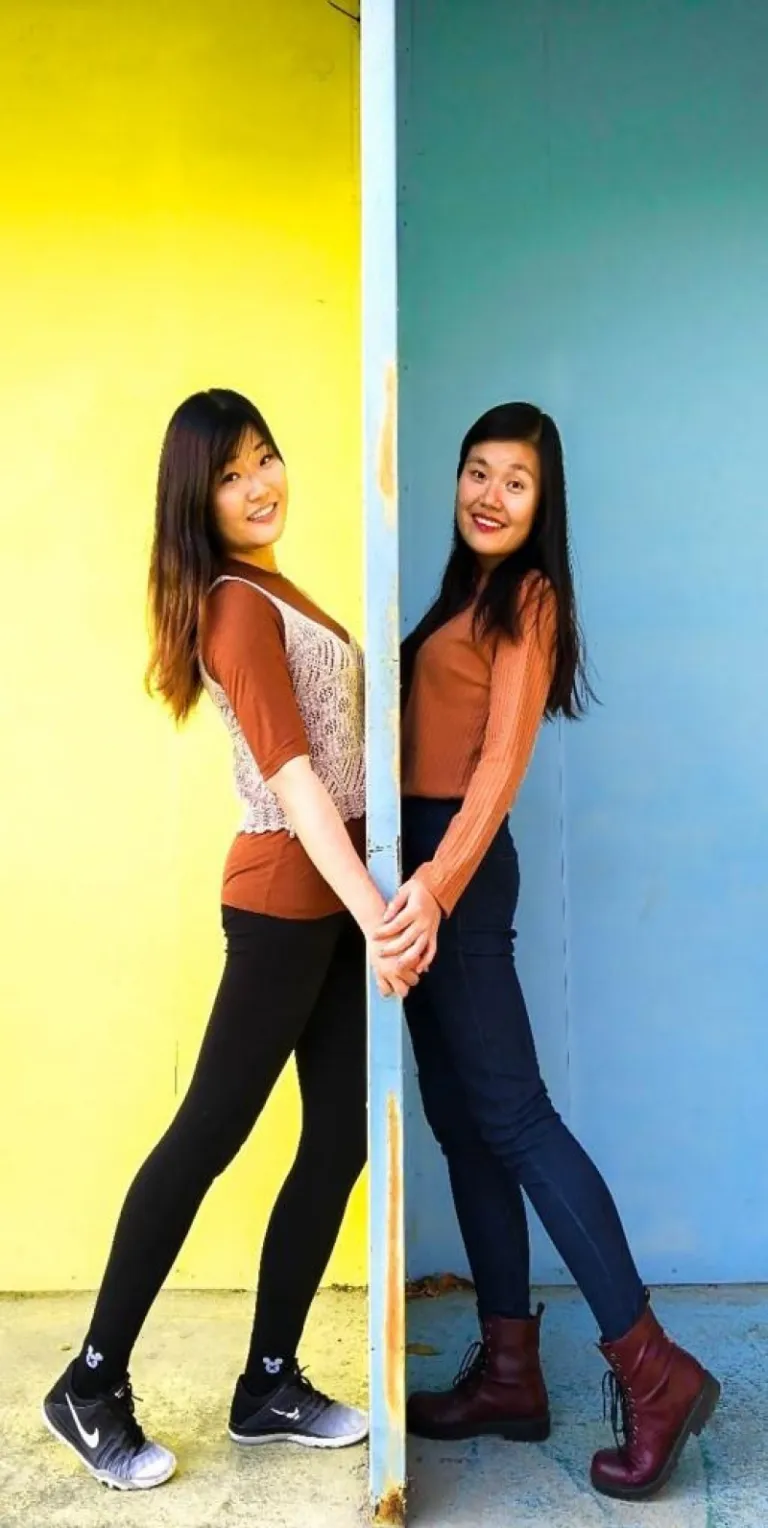 Our colour-coordinated outfit, with the complementary baby blue and pastel yellow colours, worked in harmony to bring out a cheery image. Using the partition as the centre, it brought out the contrast between two sides of the same wall. Try replicating this with your friend using another pose!