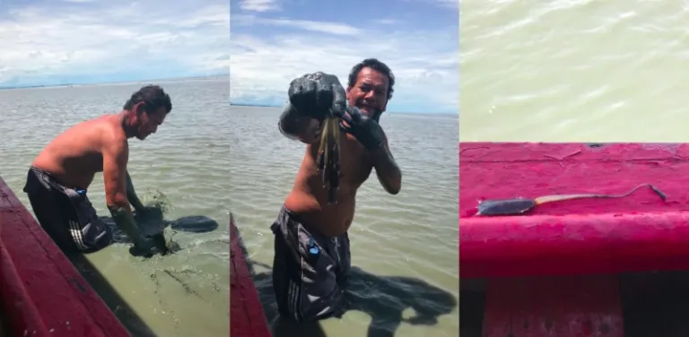 When we reached the shallower waters, we were given the option to enter the muddy waters and give a go at catching the local delicacy, which are these long-tongue creatures that live in the muddy waters.