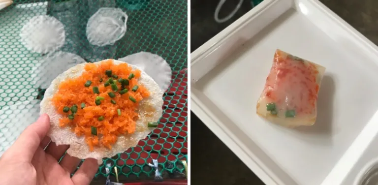 This is how the Khao Kriap Ya Na looks like in the fried (left) and steamed (right) versions. I personally like the fried version better, but you might like the steamed one if you fancy a stickier version.