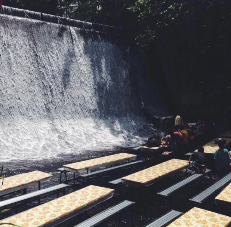 If you opt to walk barefoot to your table, you’ll notice the soft massage the bed of the waterfall gives. An array of dishes are laid out on the buffet table and visitors are invited to take as much as they can devour. Plates are covered with a banana leaf to mimic the boodle fights and kamayans Filipinos enjoy. Classic Filipino dishes like adobo, ensalada (a mango salad paired with local shrimp paste), bagoong, and all things inihaw (grilled) are also served. One thing to note is that these unique buffet lunches are weather-dependent, so keep your fingers crossed for sunshine during your visit!