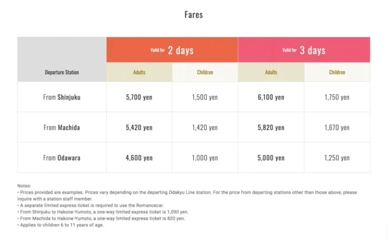 You can choose to either purchase a 2-day pass or a 3-day pass from a ticketing machine, at Shinjuku station, Machida station or the Odawara station. The price of the Hakone Free Pass depends on the choice of station you are departing from, and is shown in the table below: