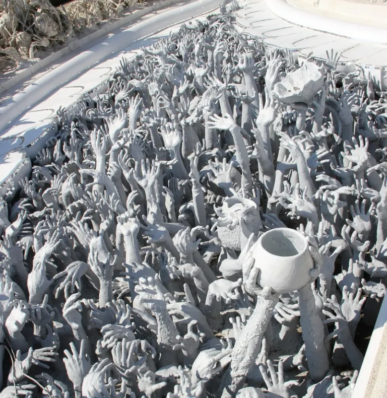 While perhaps not a graphic as many of the nation’s other hell temples, Wat Rong Khun presents two extremes. At first glance, visitors cannot help but be impressed by the stunning fairytale-like pure white and highly decorative building. Approaching the magnificent building, however, requires crossing a bridge that spans a sea of limbs stretching desperately towards the sky. Scenes of modern terror are painted on the walls inside the beautiful building.