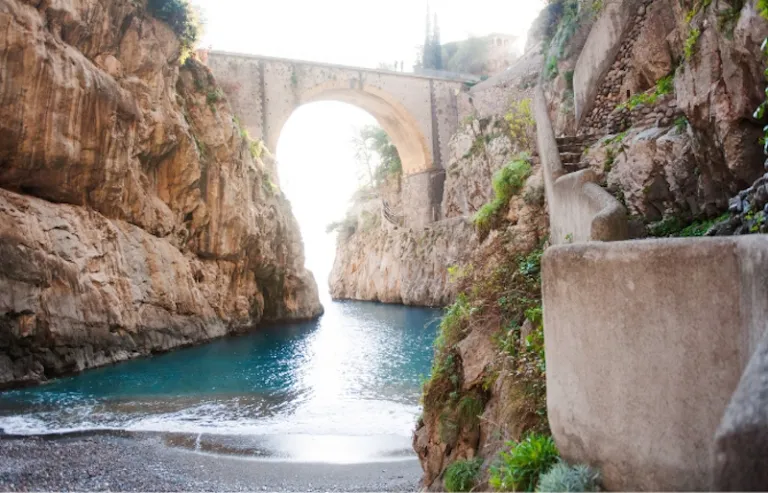 The town of Furore is a hidden gem on the Amalfi Coast. There, you’ll find the fascinating formation that is the Fiordo di Furore, which is technically not a fjord (as its name suggests) but a narrow gorge that opens to the sea. Right above this opening is a 28-metre-high bridge that’s part of a state road. It’s also the site of an annual high-diving tournament held every July!