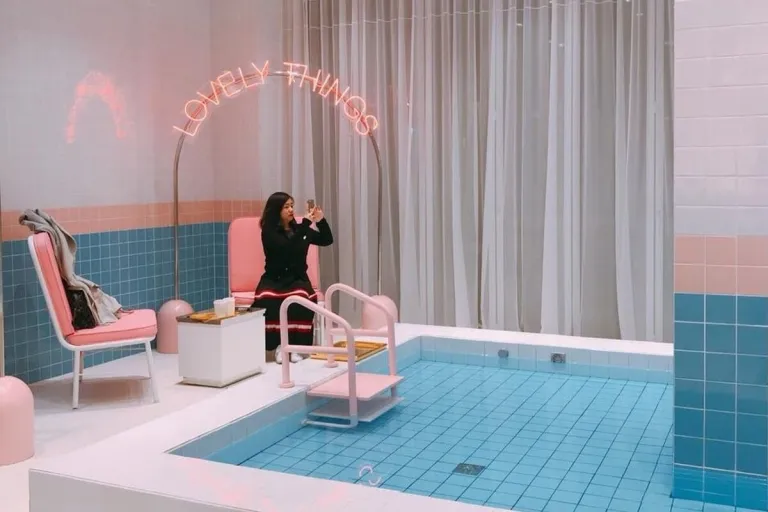 The Stylenanda Pink Cool Cafe is located on the 5th floor of their Myeongdong flagship store. In line with the store’s posh theme, the cafe is decorated like a swimming pool in an exclusive girl’s club. Shades of neon pink adorn the walls and the furniture, as guests order their drinks and relax. If the weather is good, guests can also head upstairs to the rooftop terrace.