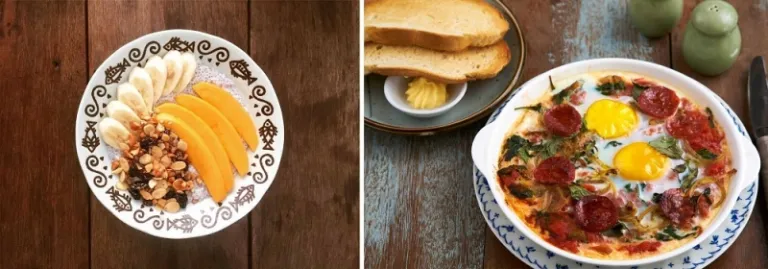 (From left to right) Egg Bake In Mini Pan, Trio Of Mini Pancake Stacks, Eggs Benedict