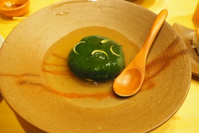 Iomochi potato cake wrapped in spinach.