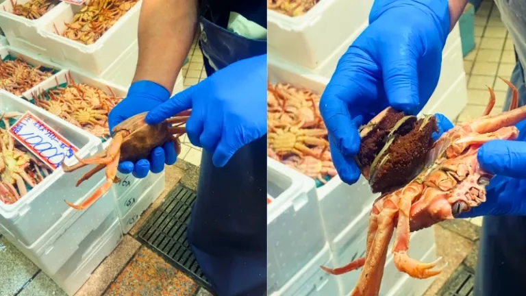 A local seafood retailer showing us the eggs inside a Kobako-gani crab