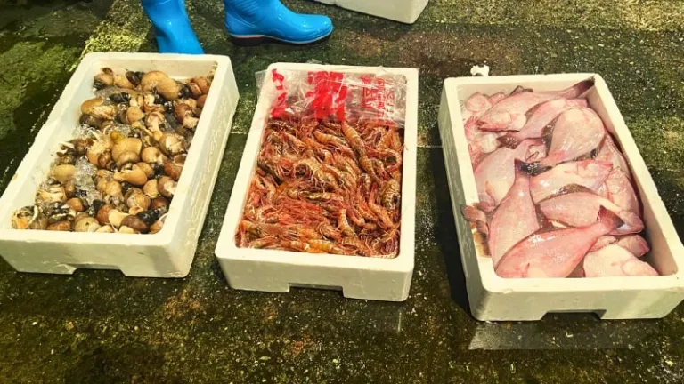 Here, a variety of seafood catches are sorted out for the auction that would take place on the same night. Various types of seafood are meticulously sorted by quality and size, and then packed into boxes with ice to maintain freshness.