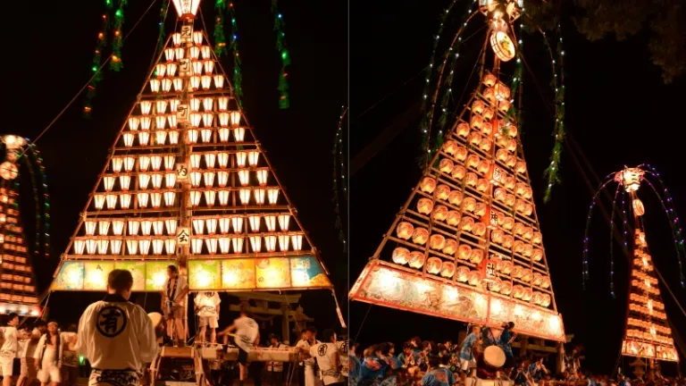 The festival culminates in the lights of the tatemon lanterns, which illuminate the night sky and are pulled around in a heroic splendour.