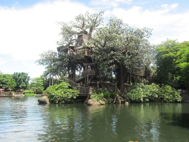 Another great photo spot is atop Tarzan’s Treehouse in Adventureland. Accessible by a log raft, the 19-metre tall towering tree offers an unblocked view of the neighbouring Tomorrowland and Grizzly Gulch.