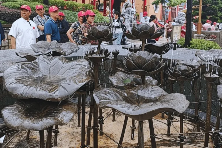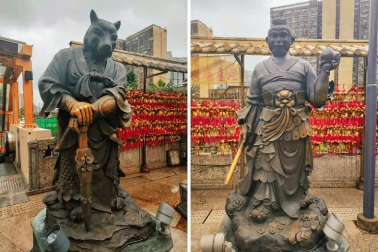 The courtyard itself is filled with brass statues of the twelve animals in the Chinese Zodiac. The surrounding wall is covered in hundreds of small, hanging brass lanterns, creating a striking tapestry of red and gold against the grey stone. Beyond the statues, a set of steps leads down to a smaller area where devotees can set their joss sticks alight in special burners before bringing them to the Main Altar for prayers.