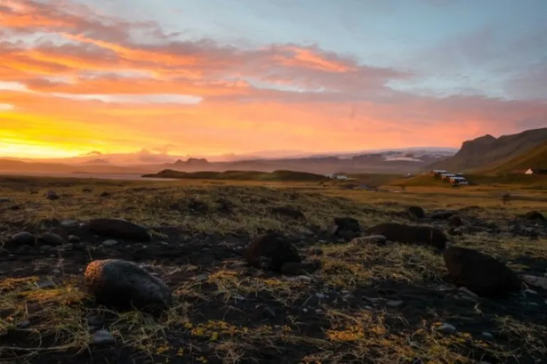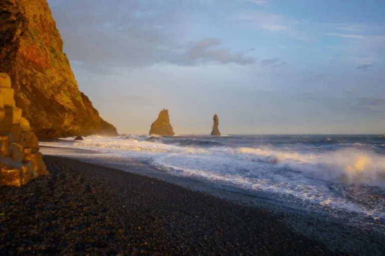 End the day with the gorgeous sunset at Reynisdrangar which is famous for the basalt sea stacks and black sand beach. There is a nice spot in Vik where the church is located to catch a nice view of the town.