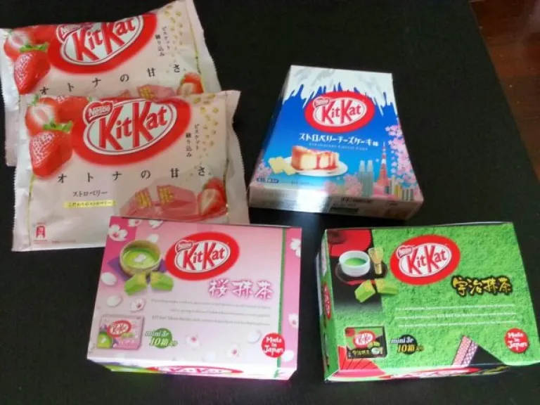 Clockwise: Strawberry kitkat, blueberry cheesecake kitkat, Uji matcha kitkat, sakura kitkat