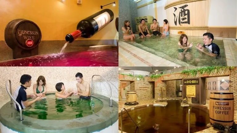 Unique attractions at Yunessun: coffee, tea, and wine pools