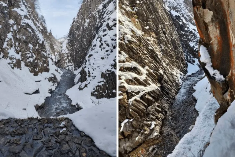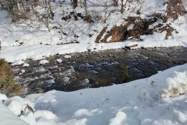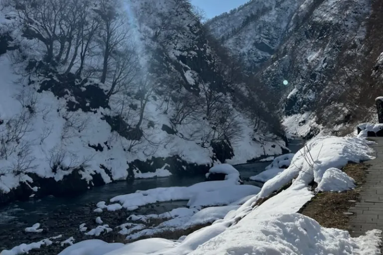 It was roughly a 20-minute drive from the Belnatio to Kiyotsu Gorge. When we arrived, I was treated to the gorgeous view of a rushing mountain river, winding its way through the icy cliffs at the tail-end of the ravine.
