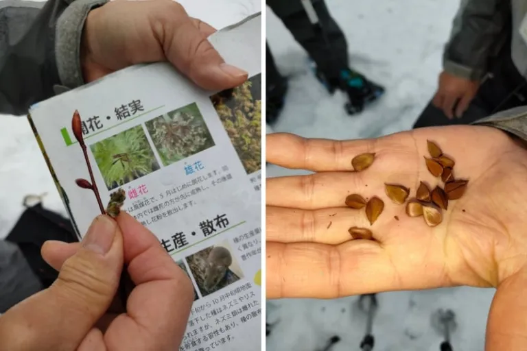 Among the many interesting things our guide showed us in the Bijin Bayashi Forest were fresh rabbit tracks in the snow, beech flower buds, and beech nuts. The nuts are edible after being peeled. I got to try some and they tasted rather pleasant. The best way to describe the flavour is a curious mix of almonds and walnut.