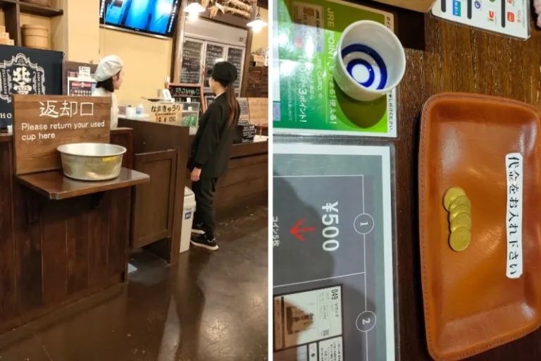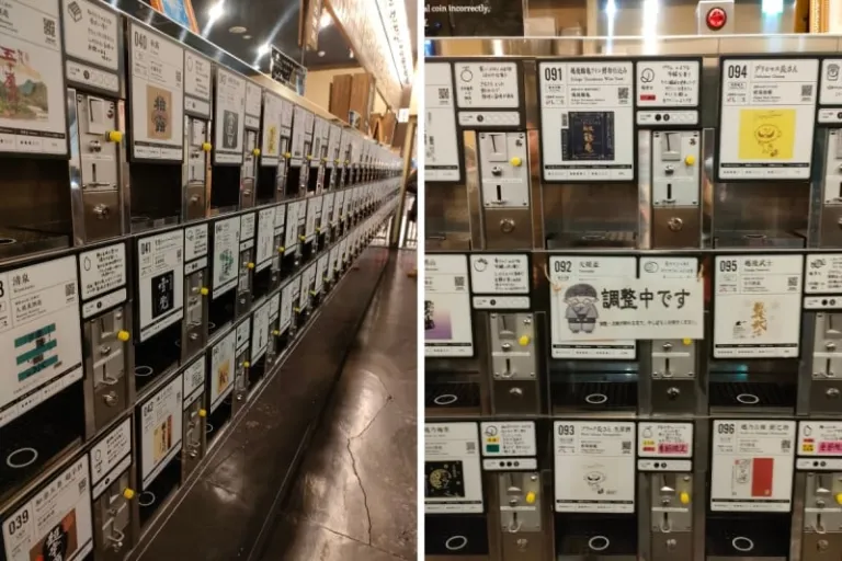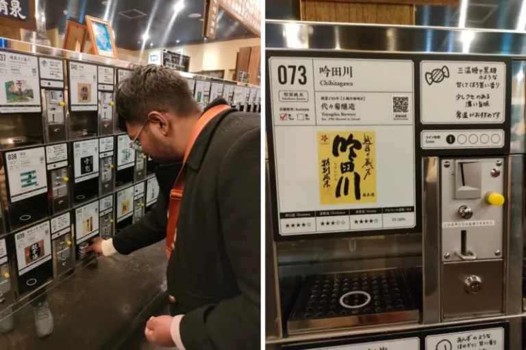 Here’s how it works. You step inside a little enclave and exchange ¥500 for five tokens. On the far wall, you’ll see what looks like little lockers at first glance. But no, these are sake vending machines.