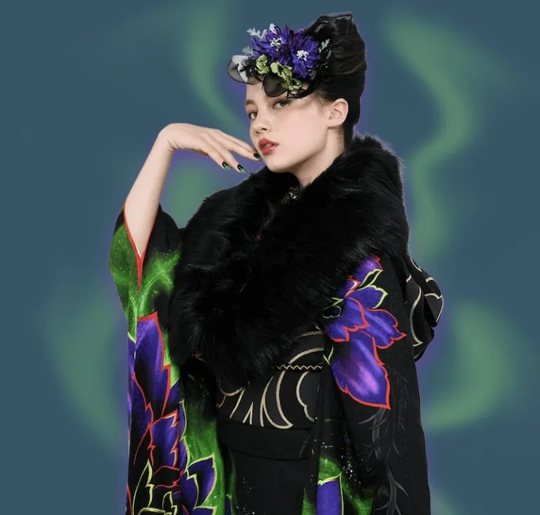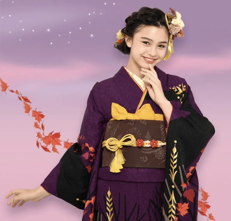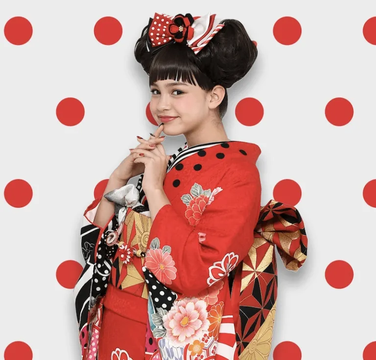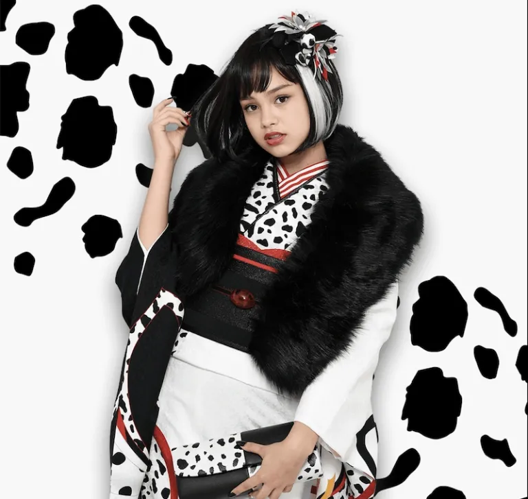 Bold patterns, polka dots, and a huge ribbon with red as the main colour — that’s definitely Minnie Mouse for you. The designers also sought to make this kimono a bit more mature by incorporating the colour black. Want to have a photoshoot with this kimono? Click here.